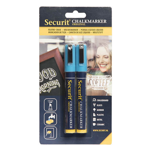 Kredni markerji MODRI, poznane znamke Securit, za pisanje po piši briši površinah, plastiki ali steklu. Dvostranska konica omogoča pisanje v 2mm ali 6mm širini. V blister setu sta dva markerja.
