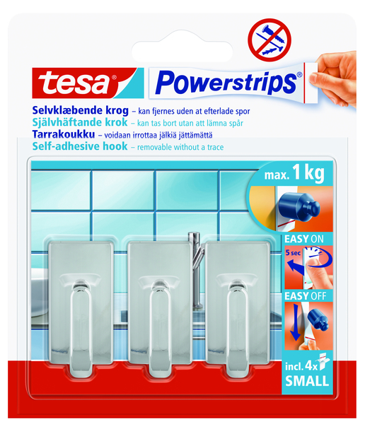 tesa Powerstrips® Kljukice MALE zanesljivo zadržijo predmete do 1 kg teže. Odlično za pritrjevanje predmetov v kuhinji, kopalnici ali na potovanju.
