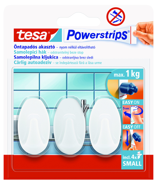 tesa Powerstrips® Kljukice MALE zanesljivo zadržijo predmete do 1 kg teže. Odlično za pritrjevanje predmetov v kuhinji, kopalnici ali na potovanju.