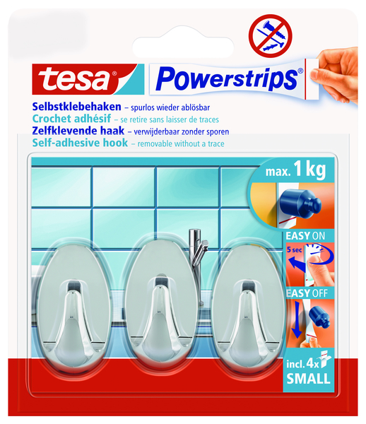 tesa Powerstrips® Kljukice MALE zanesljivo zadržijo predmete do 1 kg teže. Odlično za pritrjevanje predmetov v kuhinji, kopalnici ali na potovanju.